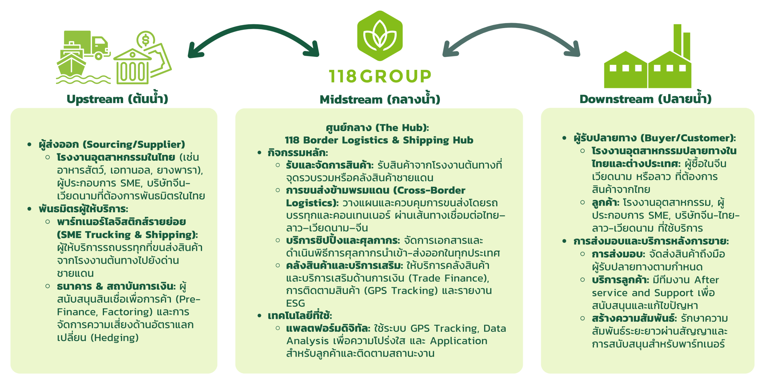 118 GROUP ให้บริการขนส่งและชิปปิ้งทางบกและทางเรือครอบคลุมการจัดการเอกสาร พิธีการศุลกากรและการประสานงานข้ามพรมแดนเพื่อให้สินค้าวัตถุดิบทางการเกษตรและผลไม้ถึงปลายทางได้ตรงเวลา มีต้นทุนที่เหมาะสม และตรวจสอบได้ทุกขั้นตอน