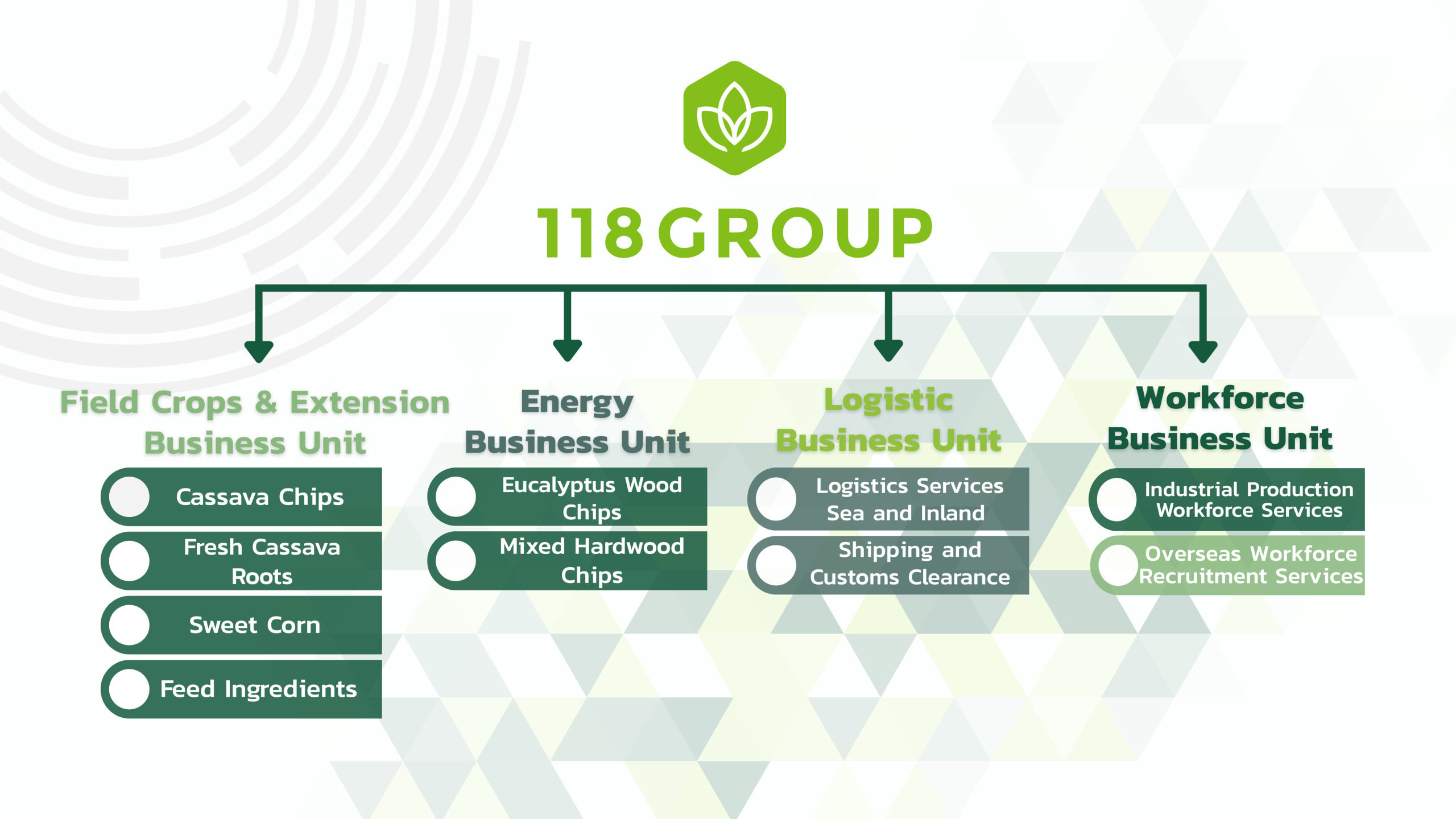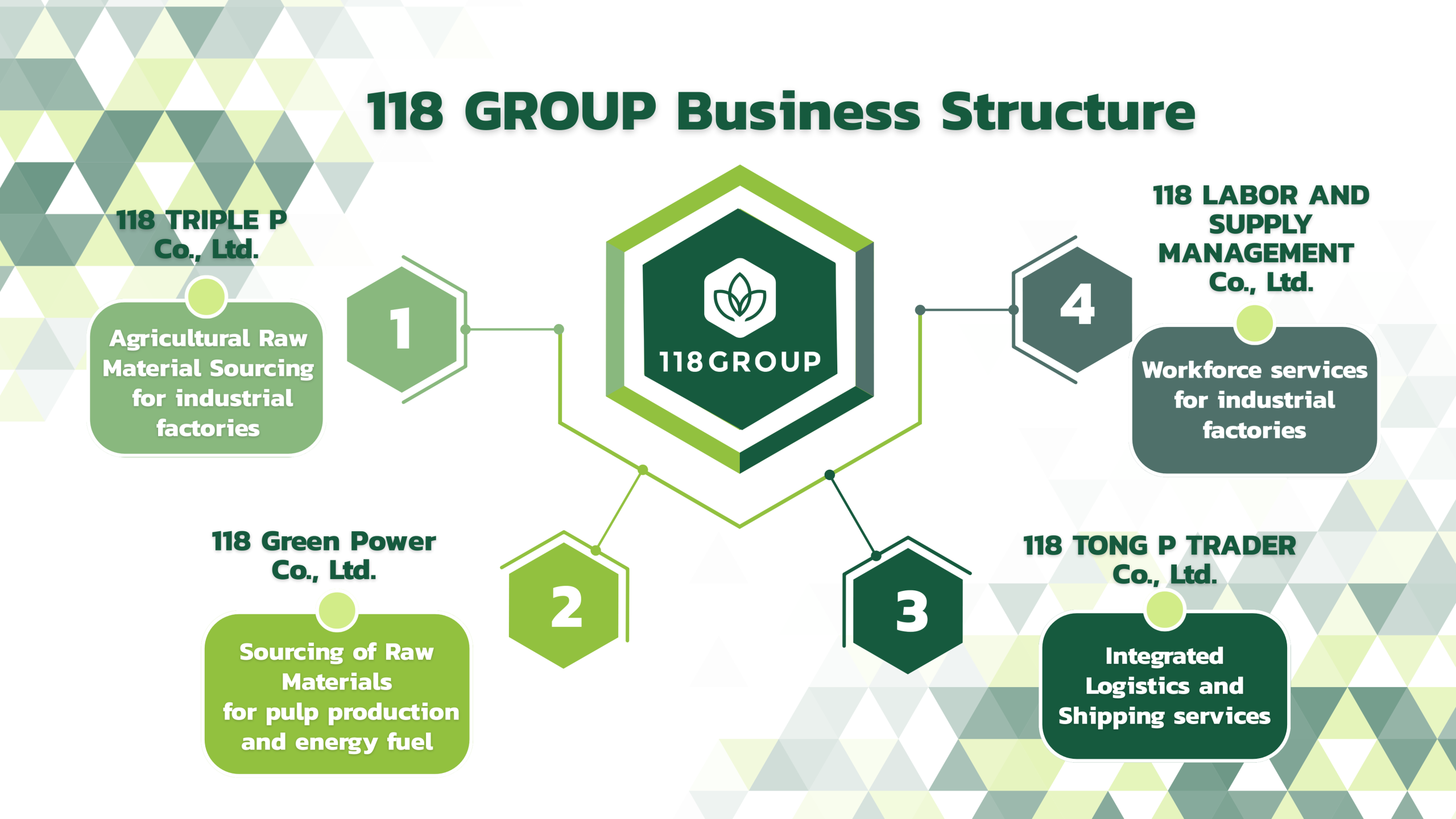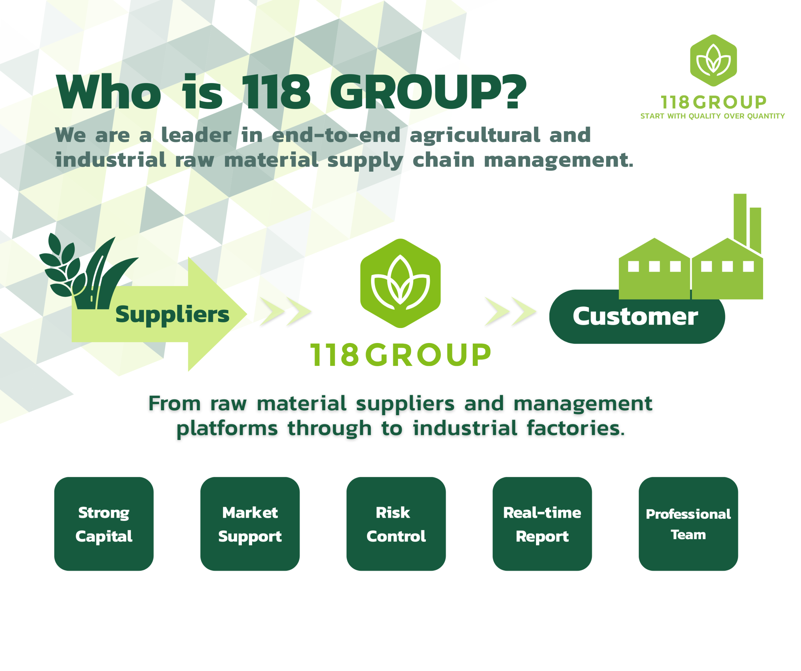 118 Group We believe modern business must be driven by data, transparency, and collaboration across the entire supply chain. We have therefore developed a comprehensive agricultural and industrial trading ecosystem—empowering farmers, suppliers, and factories to grow together sustainably at the ASEAN level.